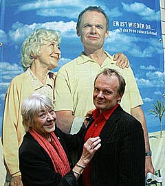 Premieren mit ELLING aber nicht ohne seine Mutter! - 05/04 Wie im Film so im Leben der Schauspieler Per Christian Ellefsen tourt derzeit mit seiner Mutter Grete Nordrå und dem Film Elling Nicht ohne meine Mutter die Premierenstädte Hamburg, Berlin und Leipzig. Das starke Team begeistert nicht nur die Presse, sondern auch die Zuschauer. Das Publikum amüsierte sich in ausverkauften Häusern z.B. in Berlin köstlich und die Reaktionen versprechen einen neuerlichen Elling-Erfolg. |