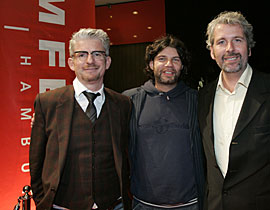 Volle Säle mit knapp 400 Zuschauern in Berlin und knapp 600 in Hamburg - das ist die Bilanz der zwei feierlichen Vorpremieren der österreichischen Komödie IMMER NIE AM MEER von Antonin Svoboda mit Heinz Strunk ("Fleisch ist mein Gemüse") und dem Duo Grissemann und Stermann in den Hauptrollen. Am 27. September lud der Arsenal Filmverleih zusammen mit radio eins in die Kulturbrauerei zur Berliner Vorpremiere. Heinz Strunk und Dirk Stermann erzählten von den bequemen Dreharbeiten ("Wir mussten manchmal stehen, das war anstrengend.") und Knut Elstermann vom RBB führte flott und mit viel Humor durch den Abend. Stand die Premiere in Berlin noch ganz unter dem Zeichen des österreichischen Komiker-Duos Grissemann und Stermann - bekannt durch Ihre "Show Royal" auf radio eins - waren in Hamburg viele Fans des gebürtigen Harburgers Heinz Strunk unter den Zuschauern. So amüsierten sich am 30. September knapp 600 Kinogänger im vollen Saal des Grindel-UFA-Palastes köstlich über die Not der drei und beklatschten nach dem Film neben den Darstellern ebenfalls Regisseur Antonin Svoboda, der sich den zahlreichen Fragen des Publikums stellte. Die Premiere fand im Rahmen der Reihe "Nordlichter" des Filmfestes Hamburg statt. Im Anschluss wurde bei Prosecco und Heringssalat ausgelassen gefeiert. Seit 4. Oktober ist der Film bundesweit in den Kinos. Heinz Strunk geht vom 7. bis zum 11. Oktober auf Kinotour nach Hamburg, Bremen, Münster, Köln und Düsseldorf. vlnr: Heinz Strunk, Antonin Svoboda, Dirk Stermann |